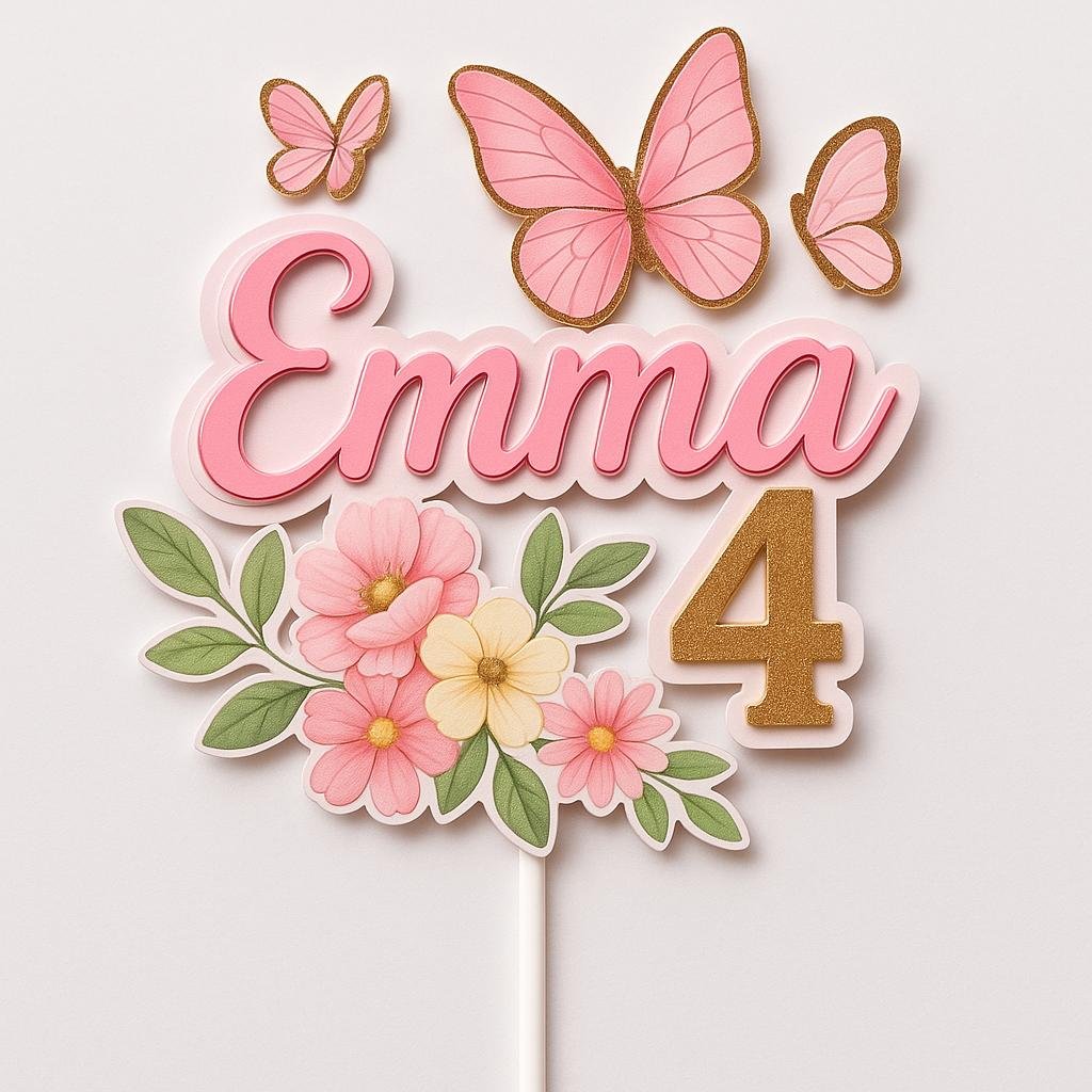 Topper cake 3D personnalisé, ambiance fleurs/papillons ou thème choisi.