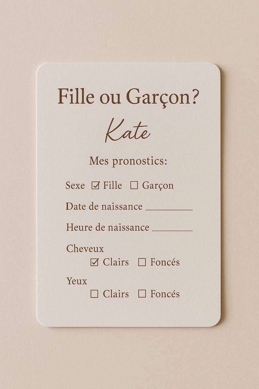 Cette carte ludique permet à vos invités de faire leurs prédictions tout en s’intégrant harmonieusement à votre décoration et à votre papeterie.